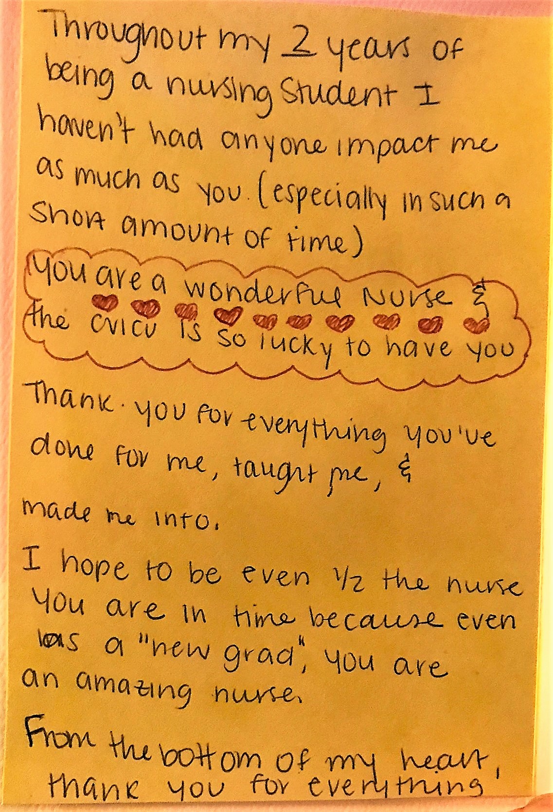 Becca said “yes” and was soon working with Claudia Jacobs, a nursing student at Notre Dame of Maryland University. “Throughout the practicum, Claudia shadowed me and worked with me for over 150 hours,” says Becca. “It was amazing to see how much knowledge and confidence she gained in those 150 hours alone!” At the end of their time together, Claudia surprised Becca with an assortment of small gifts. There was also a heartfelt, handwritten note that said: