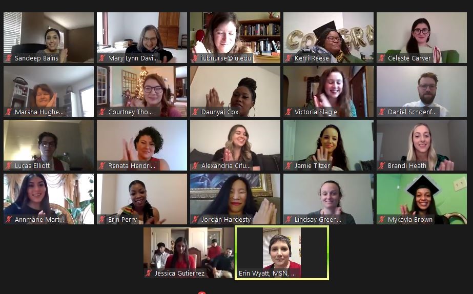 Highlights of our live Zoom component included opening remarks by Associate Dean Mary Lynn Davis-Ajami and a keynote address by Clinical Assistant Professor Dr. Marsha Hughes-Gay, who was chosen by our seniors to give the address. Clinical Assistant Professor Erin Wyatt called the roll of names for our graduating seniors. The ceremony concluded with Dr. Davis-Ajami leading our new graduates in reciting the IU School of Nursing pledge.